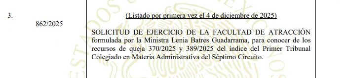 En sesión que se llevó a cabo este jueves 11 de diciembre, se planteó la solicitud de ejercicio de la facultad de atracción formulada por la Ministra Lenia Batres Guadarrama, para conocer de los recursos de queja 370/2025 y 389/2025 del índice del Primer Tribunal Colegiado en Materia Administrativa del Séptimo Circuito.