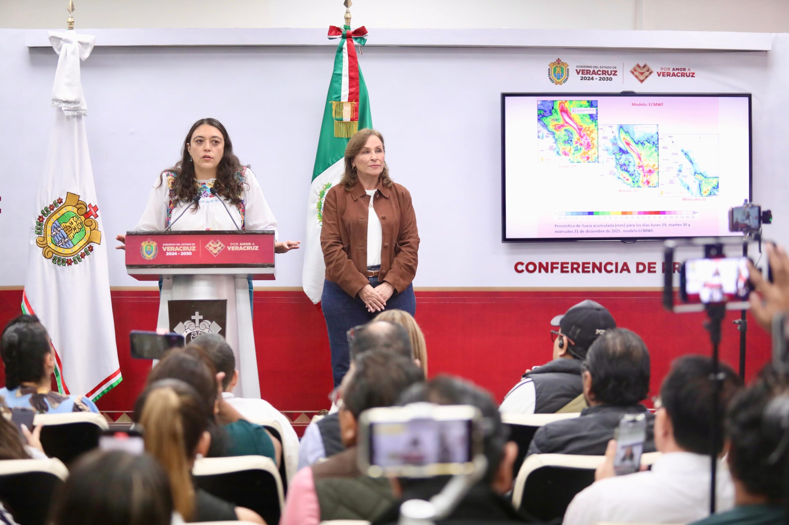 En conferencia de prensa, la secretaria de Protección Civil, Guadalupe Osorno Maldonado, reiteró que el Frente Frío 25 generará un evento de Norte con rachas de viento que podrían alcanzar hasta 110 kilómetros por hora, así como lluvias en el sur del estado, en regiones como Los Tuxtlas, las cuencas de los ríos Tonalá y Coatzacoalcos, y en la franja costera de Tecolutla hacia Actopan.