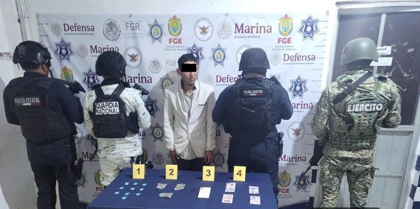 Como parte del apoyo a cateos realizados por la Fiscalía General del Estado, fue detenida una persona y se decomisaron nueve dosis y una bolsita de presunto cristal, 16 dosis de hierba seca con características similares a la marihuana, pipas de cristal, pasamontañas, camisolas tipo militar, gorras y una tabla de castigo.