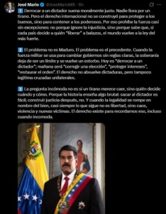 El abogado y analista jurídico José Mario de la Garza Marroquín expresó su postura crítica sobre el uso de la fuerza militar para derrocar gobiernos, a raíz de los recientes acontecimientos internacionales entre Venezuela y Estados Unidos. A través de una serie de mensajes publicados en la red social X, el jurista advirtió que, más allá de la figura de un dictador, el verdadero riesgo radica en el precedente que se establece para el derecho internacional y la soberanía de los Estados.