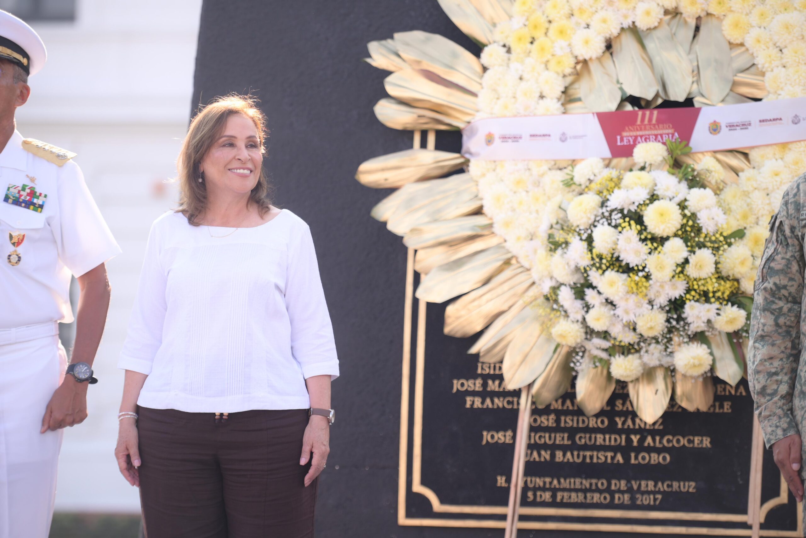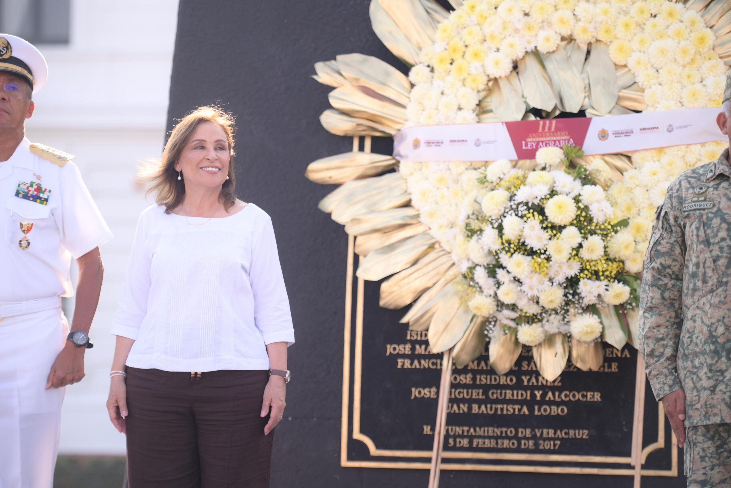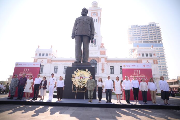 Veracruz, Ver., martes 6 de enero de 2026.– Con una guardia de honor y el depósito deofrenda floral ante el monumento a Venustiano Carranza, la gobernadora Rocío Nahle García, junto con autoridades de los tres órdenes de gobierno, conmemoró el 111 aniversario de la promulgación de la Ley Agraria.