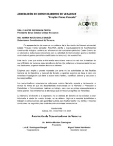 En el documento, dirigido a la presidenta de México, Claudia Sheinbaum Pardo, y a la gobernadora de Veracruz, Norma Rocío Nahle García, la organización lamentó el crimen y señaló que este hecho enluta a una familia veracruzana más, además de evidenciar, una vez más, las condiciones de riesgo en las que se ejerce el periodismo en la entidad.