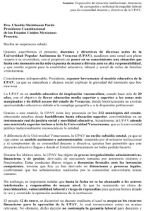 Veracruz, Ver.— Docentes y directivos de la Universidad Popular Autónoma de Veracruz (UPAV) anunciaron que este viernes entregarán una carta a la presidenta de México, Claudia Sheinbaum Pardo, para solicitar su intervención ante una serie de irregularidades administrativas, financieras y de gestión que, aseguran, los mantienen sin salario desde hace casi un año y sin reconocimiento de su antigüedad laboral.