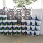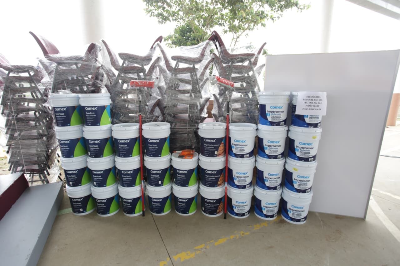 La entrega incluyó mil 245 cubetas de pintura, 950 de impermeabilizante, 3 mil 948 sillas para mesa trapezoidal, mil 974 mesas trapezoidales, 340 pizarrones y 61 pantallas, destinados a 62 primarias, 10 secundarias federales y 16 telesecundarias.