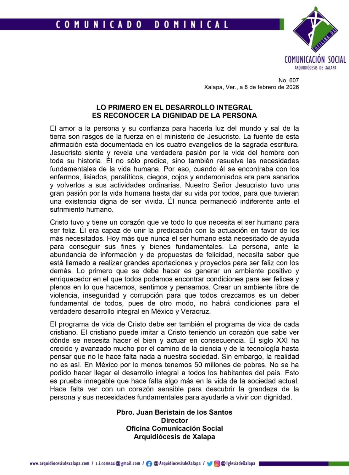 Como si el cristianismo hubiera logrado la transformación de la humanidad en 2 mil años de existencia, el padre Juan Beristain de los Santos, vocero de la Arquidiócesis de Xalapa, lamento que no haya podido hacer llegar el desarrollo integral a todos los habitantes del país, con los gobiernos actuales.