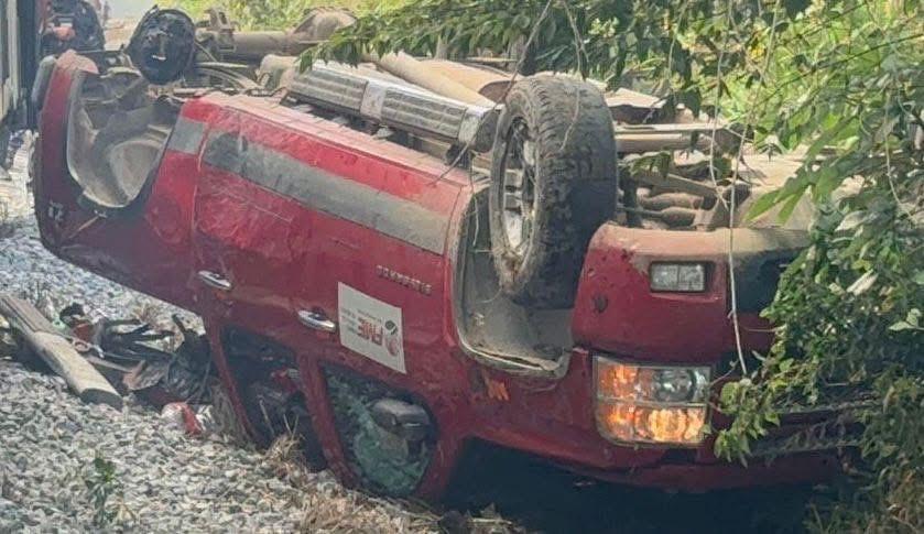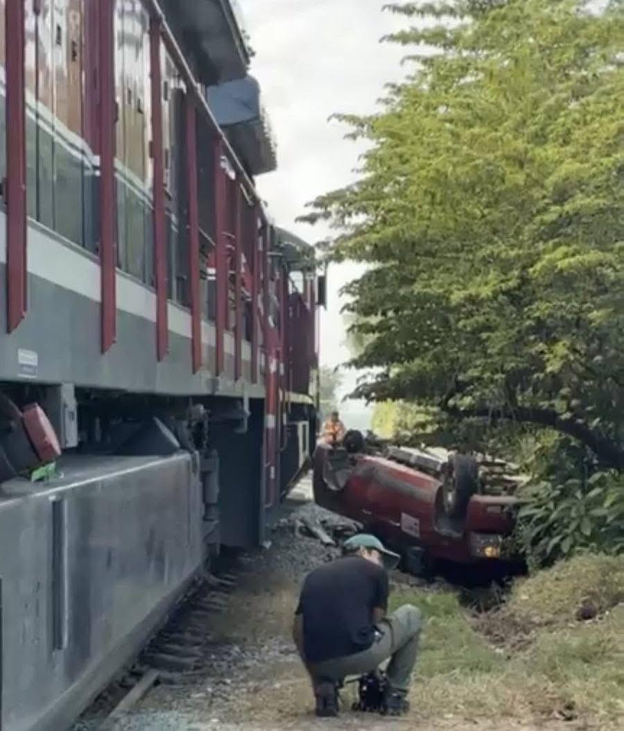 La camioneta con placas de origen extranjero fue arrastrada por impactada y arrastrada por el tren, para finalmente quedar volcada a un costado de la vía.