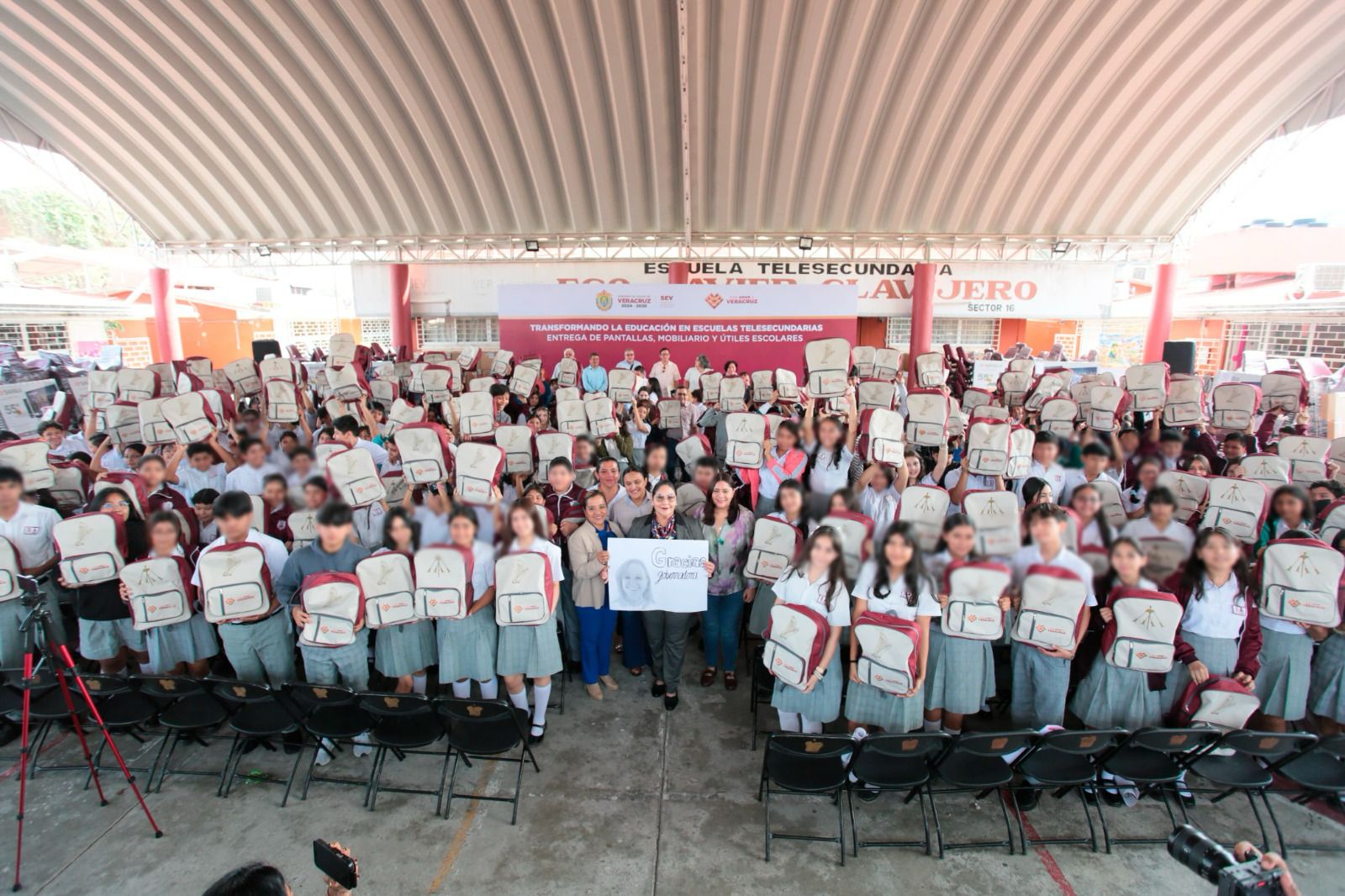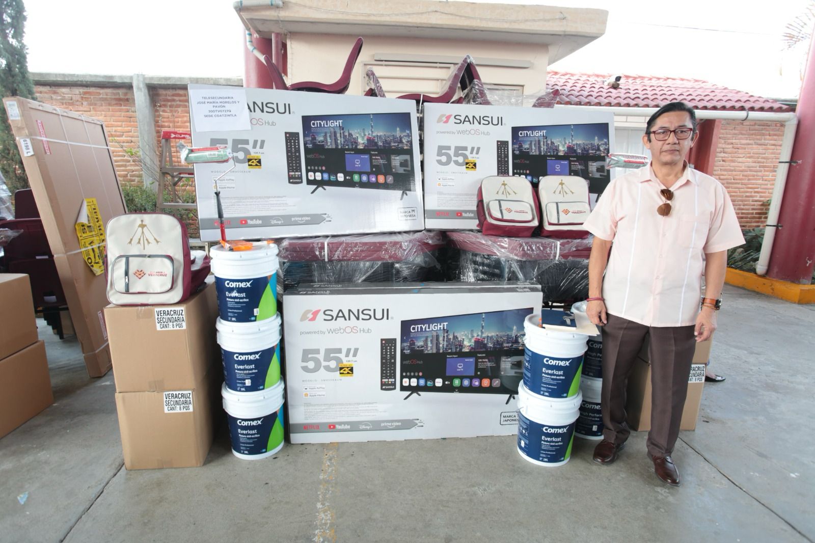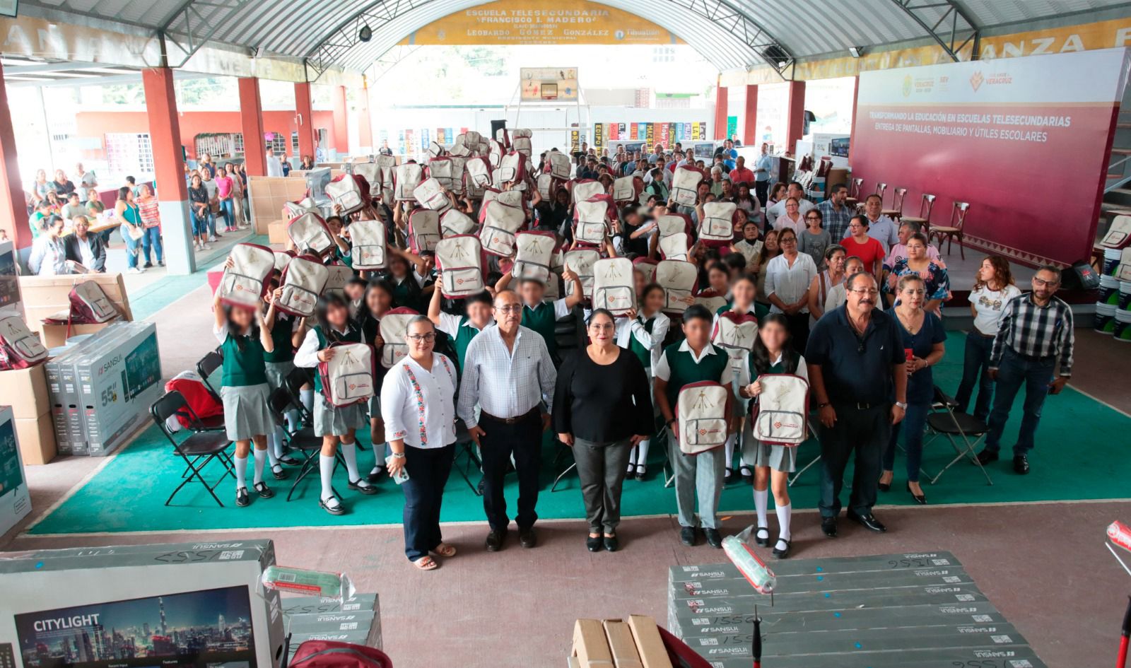Este jueves fueron entregadas 586 sillas, 293 mesas trapezoidales, 176 pantallas, 167 pizarrones blancos, 4 mil 96 mochilas y 262 cubetas de pintura, brochas y rodillos para 45 telesecundarias de los municipios de Coatzintla y Tihuatlán, beneficiando a 4 mil 96 estudiantes.