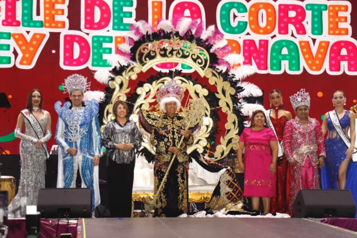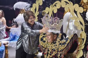 Ataviado con un majestuoso traje en tonos negros y dorados, “Nayo I” fue coronado por la alcaldesa de Veracruz, Rosa María Hernández Espejo, y recibió el cetro de la reina electa 2026, Fernanda Pumar, en un acto solemne que contó con la presencia de la secretaria de Cultura, Xóchitl Molina González.