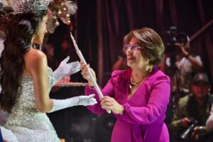 - Ante miles de personas, la gobernadora Rocío Nahle García coronó a la Reina de la “Fiesta de Todos”, mientras la alcaldesa de Veracruz, Rosa María Hernández le entregó el cetro que la acompañará durante su reinado.