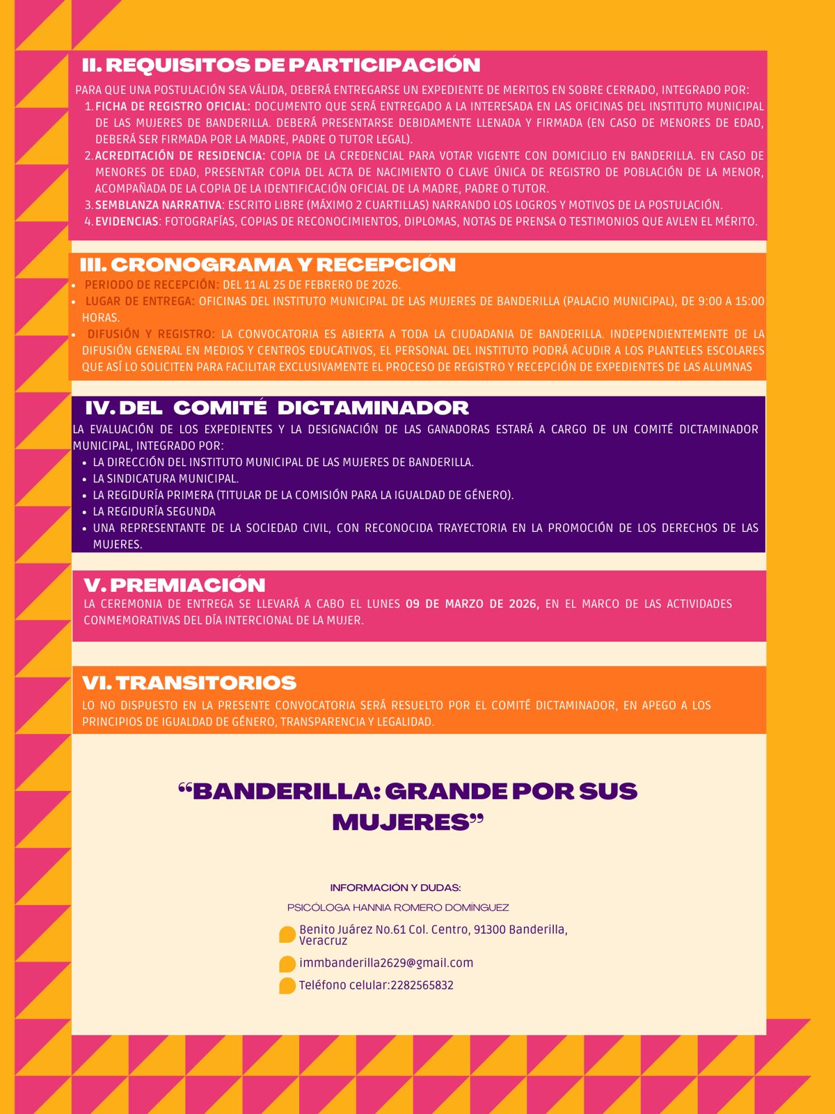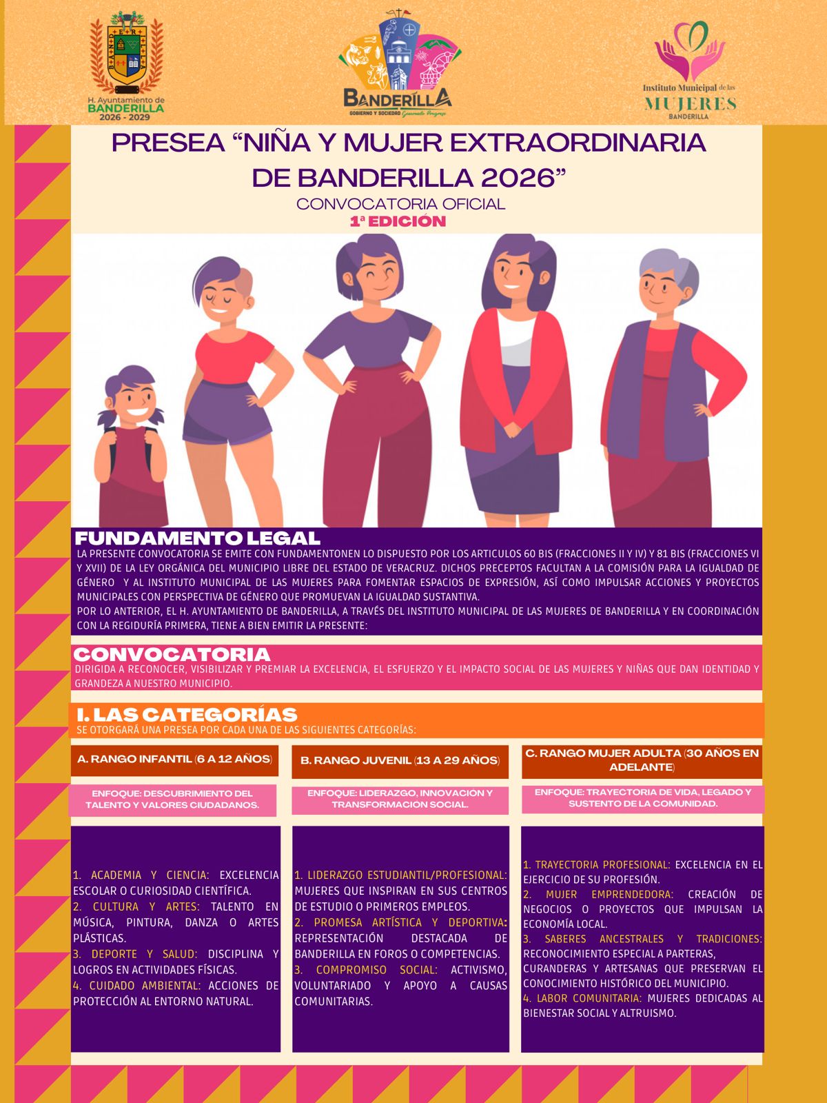 Con el propósito de reconocer, visibilizar y premiar la excelencia, esfuerzo y el impacto social que realizan las mujeres y niñas de Banderilla, cuyo esfuerzo y trabajo le dan identidad y grandeza a nuestro municipio, se lanzó la convocatoria para la entrega de la presea: “Niña y Mujer Extraordinaria de Banderilla 2026”.