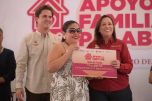 En la Unidad Deportiva ESBIO de San Andrés Tuxtla, la Mandataria encabezó el arranque y primera entrega de los programas Apoyo a la Palabra y Apoyo a la Familia, estrategia conjunta de la Secretaría de Desarrollo Social y el Sistema Estatal DIF que, en 2026, se extenderá a 112 municipios con una inversión global de 200 millones de pesos.
