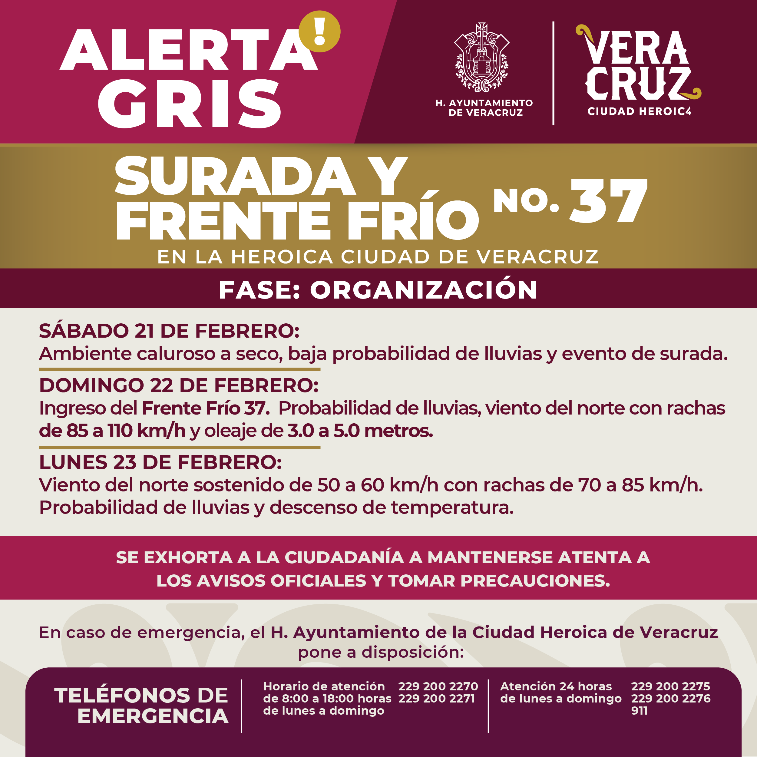 La dirección de Protección Civil del Ayuntamiento de Veracruz activa la Alerta Gris en Fase de Organización, ante el pronóstico de surada para este sábado, así como la entrada del Frente Frío número 37 a partir del domingo, dando lugar a un evento de norte violento y descenso de temperatura en la ciudad.