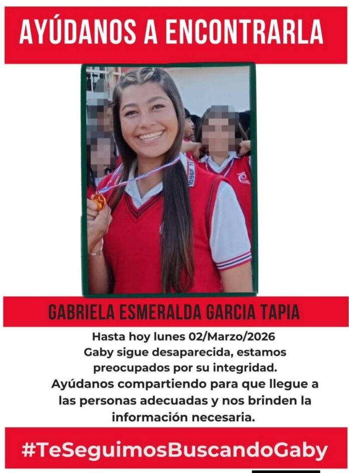 Cabe mencionar que la Fiscalía Especializada para la Atención de Denuncias de Personas Desaparecidas publicó un boletín de búsqueda de Protocolo Alba para solicitar la colaboración en localizar a Gabriela Esmeralda García Tapia, desaparecida el pasado viernes 27 febrero 2026, en el municipio de Banderilla, Veracruz.