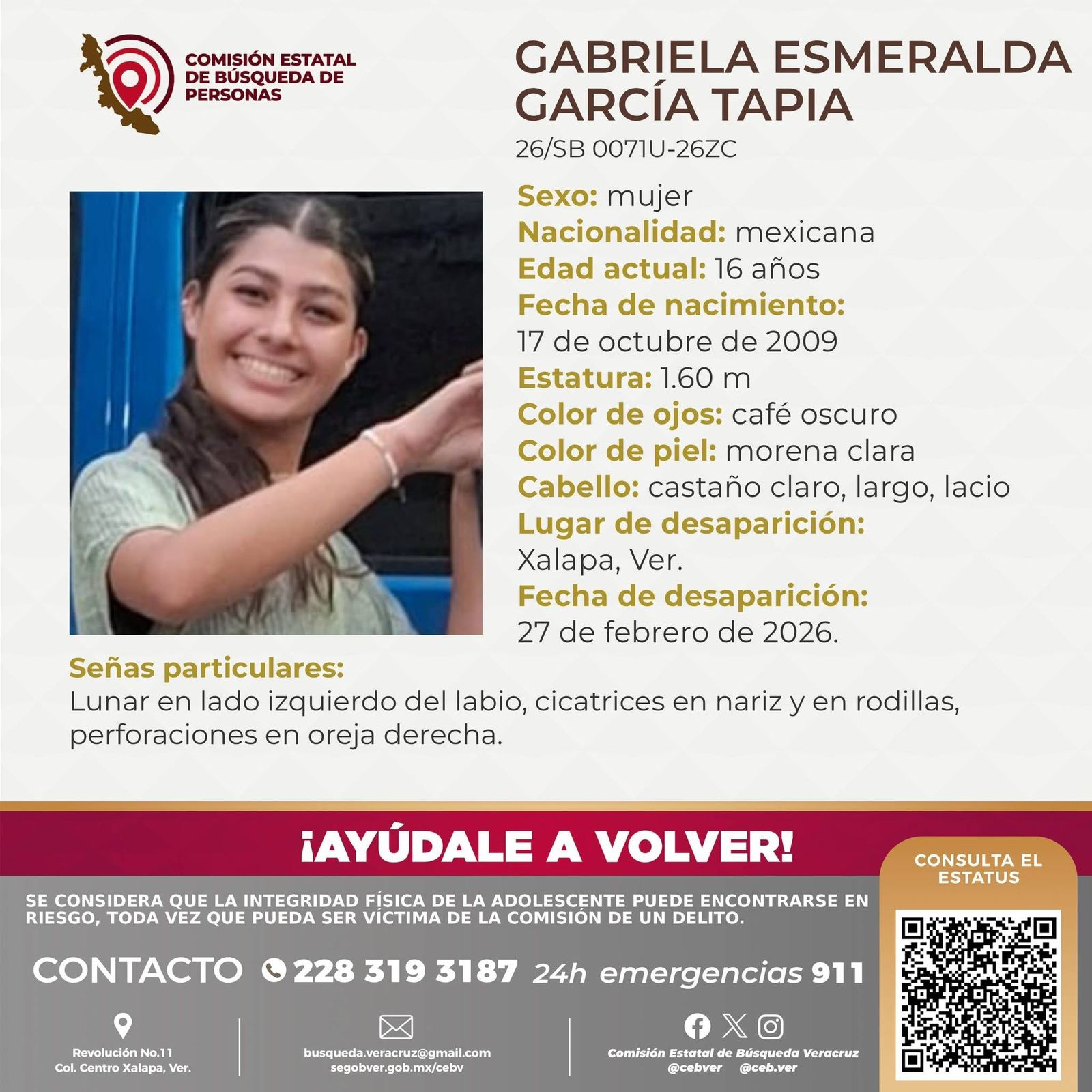 En el boletín de búsqueda se detalla que Gabriela Esmeralda es una menor de 16 años de edad, originaria de Xalapa, tiene una estatura de