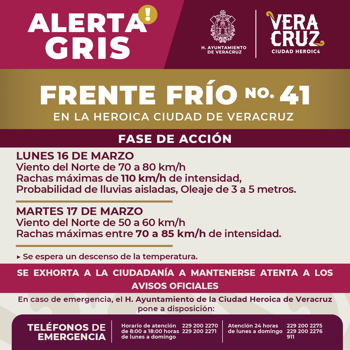 Ante el ingreso del Frente Frío 41 y la presencia de viento del norte en la ciudad de Veracruz, la Dirección de Protección Civil Municipal exhorta a la ciudadanía a extremar precauciones, mantenerse informada sobre la evolución del clima y evitar riesgos en zonas expuestas al viento, oleaje o lluvias. Se prevén vientos de 70 a 80 km/h con rachas de hasta 110 km/h.