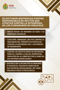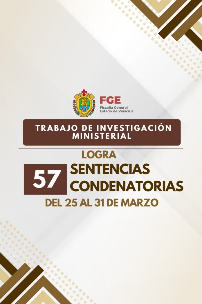 Xalapa, Ver., 1 de abril de 2026.- La Fiscalía General del Estado de Veracruz informó que, como resultado del trabajo de investigación ministerial, del 25 al 31 de marzo se obtuvieron 57 sentencias condenatorias contra responsables de diversos delitos que afectan a la sociedad veracruzana.
