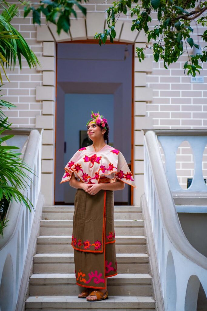 Este traje conserva elementos con un profundo significado histórico y simbólico. Destaca el quechquémitl blanco, acompañado de la falda o cueyitl en tonos café, así como el ceñidor con diseños representativos.