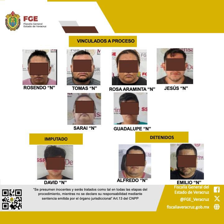En Acayucan, se logró la vinculación a proceso de Rosendo “N”, Tomás “N” y Rosa Araminta “N”, señalados como presuntos responsables de extorsión agravada, por hechos ocurridos el 14 de marzo de 2026, cuando habrían exigido dinero bajo el esquema de “cobro de piso”. Asimismo, en ese mismo municipio, Sarai “N” fue vinculada a proceso por su presunta participación en un hecho similar registrado el 18 de marzo.