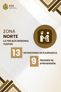 Dentro de la zona norte, se reportó 1 detención en flagrancia y el cumplimiento de 7 órdenes de aprehensión por parte de la Fiscalía Regional Tantoyuca, mientras que la Fiscalía Regional Tuxpan llevó a cabo 13 detenciones en flagrancia y ejecutó 9 órdenes de aprehensión.