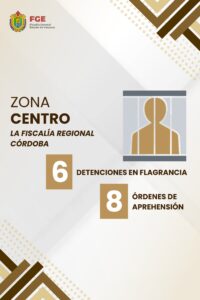 Asimismo, en la zona centro, la Fiscalía Regional Veracruz concretó 9 detenciones en flagrancia y cumplimentó 5 órdenes de aprehensión; en tanto que la Fiscalía Regional Córdoba registró 6 detenciones en flagrancia y ejecutó 8 órdenes.