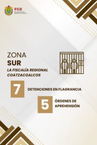 En lo que respecta a la zona sur, la Fiscalía Regional Coatzacoalcos cumplimentó 5 órdenes de aprehensión y realizó 7 detenciones en flagrancia.