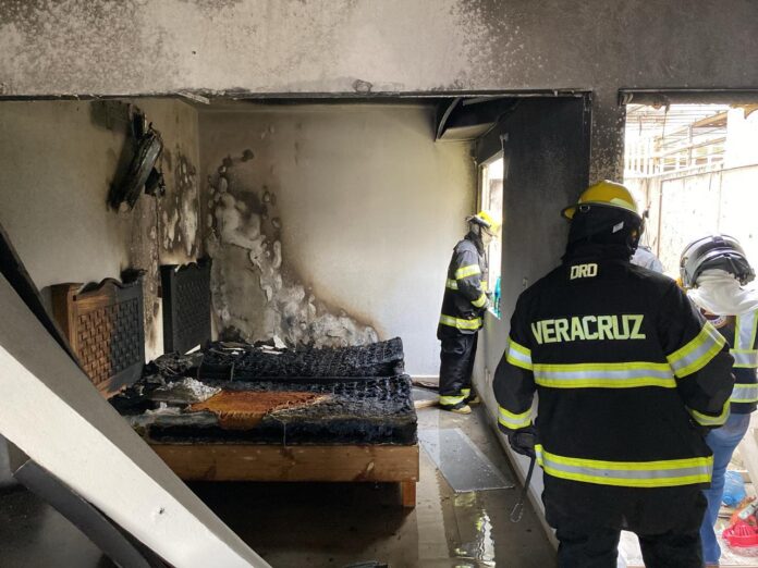 Elementos de Bomberos y de la Dirección de Protección Civil Municipal de Veracruz atendieron un incendio en una vivienda del fraccionamiento Dream Lagoons, presuntamente originado por una explosión derivada de acumulación de gas en las instalaciones domésticas.