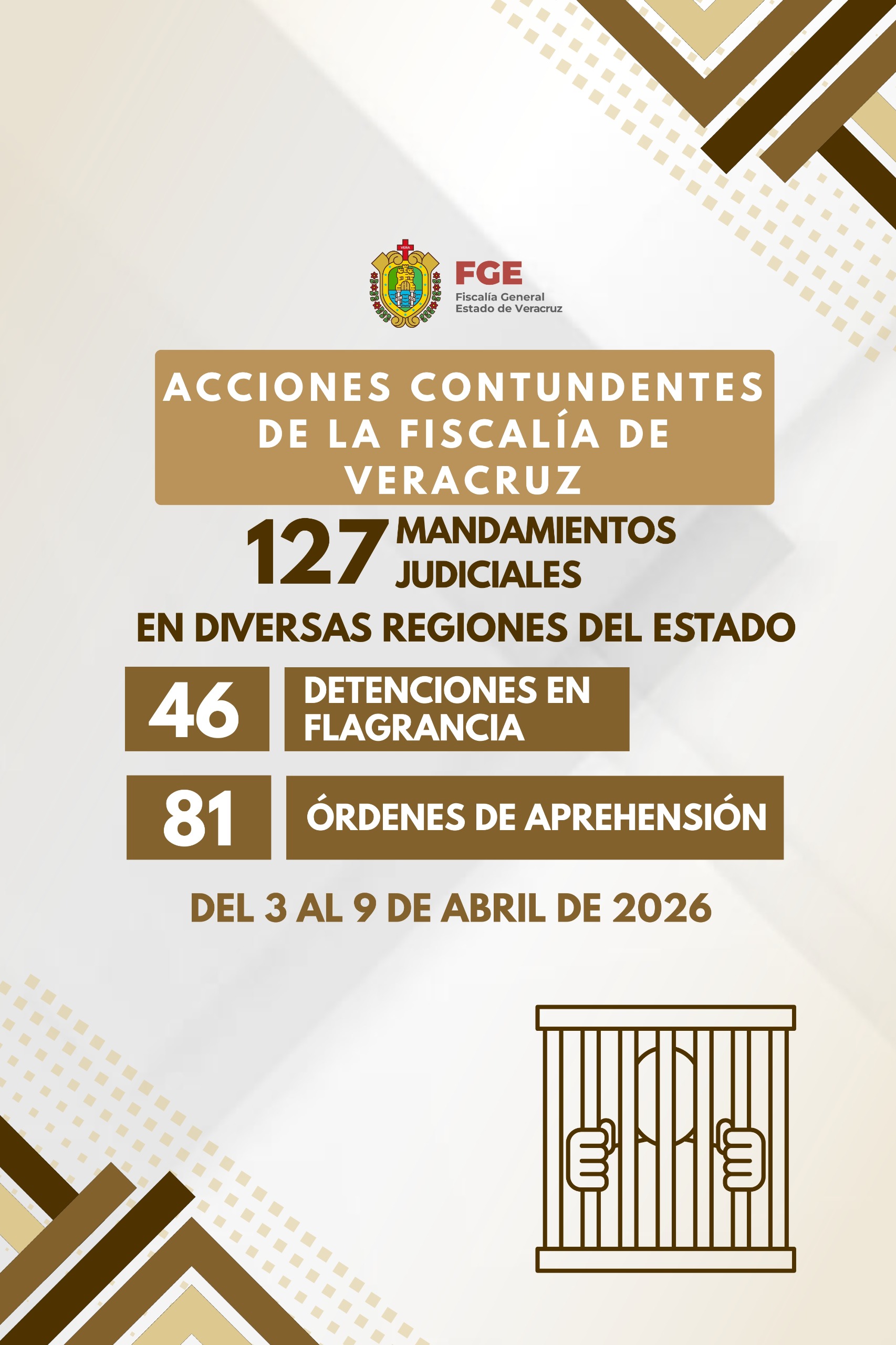 Xalapa, Ver., 10 de abril de 2026.- Como resultado del fortalecimiento de las investigaciones ministeriales y del despliegue operativo de campo, durante el periodo comprendido del 3 al 9 de abril, la Fiscalía General del Estado de Veracruz, a través de la Dirección General de la Policía Ministerial, cumplimentó 127 mandamientos emitidos por la autoridad judicial, lo que permitió realizar 46 detenciones en flagrancia y ejecutar 81 órdenes de aprehensión.