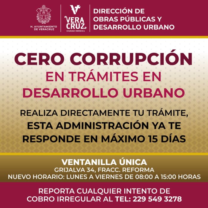 El Ayuntamiento de Veracruz reafirma su compromiso con una política de Cero Corrupción en todas sus áreas, destacando que los trámites de Desarrollo Urbano, que anteriormente podían tardar hasta cinco meses, hoy se realizan de manera directa, transparente y con respuesta en máximo 15 días.