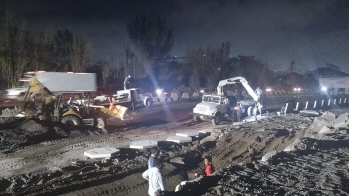 Durante el horario nocturno, las cuadrillas realizan trabajos de colocación de escamas en el acceso 1, del lado Xalapa, lo que permite avanzar en la conformación de los muros mecánicamente estabilizados (MSE) que formarán parte de los accesos al puente.