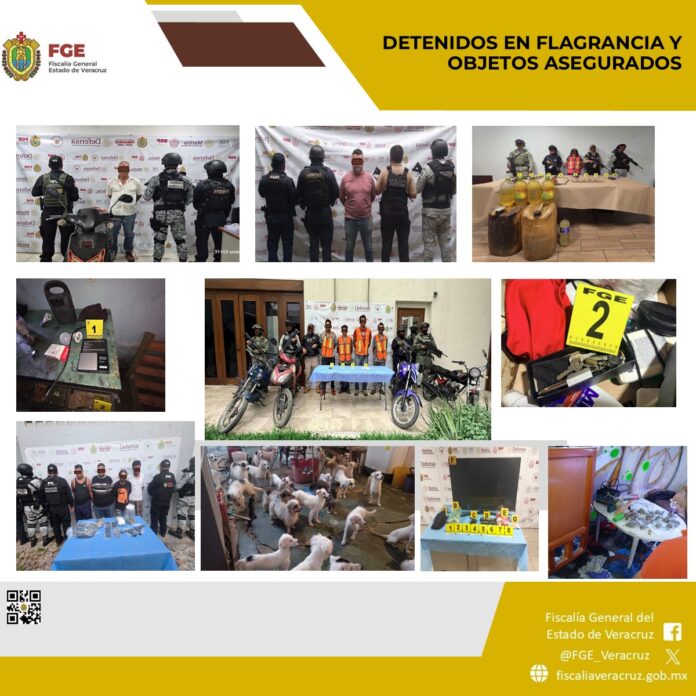Xalapa, Ver., 27 de abril de 2026.- En el marco de una estrategia operativa orientada a fortalecer la paz social, durante el periodo del 20 al 26 de abril, la Fiscalía General del Estado de Veracruz, a través de sus Fiscalías Regionales, logró la detención en flagrancia de 30 personas presuntamente vinculadas a actividades ilícitas, durante la ejecución de 43 cateos autorizados por la autoridad judicial en 38 municipios.