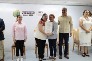Xalapa, Ver., martes 28 de abril de 2026.- Planteles con hasta 94 años de antigüedad, como la Secundaria Oficial A Lic. Marco Antonio Muñoz T. y el Bachillerato Oficial de Alvarado, recibieron sus documentos de propiedad por parte de la Secretaría de Educación de Veracruz (SEV), como parte del programa Patrimonio Seguro, Educación con Futuro.